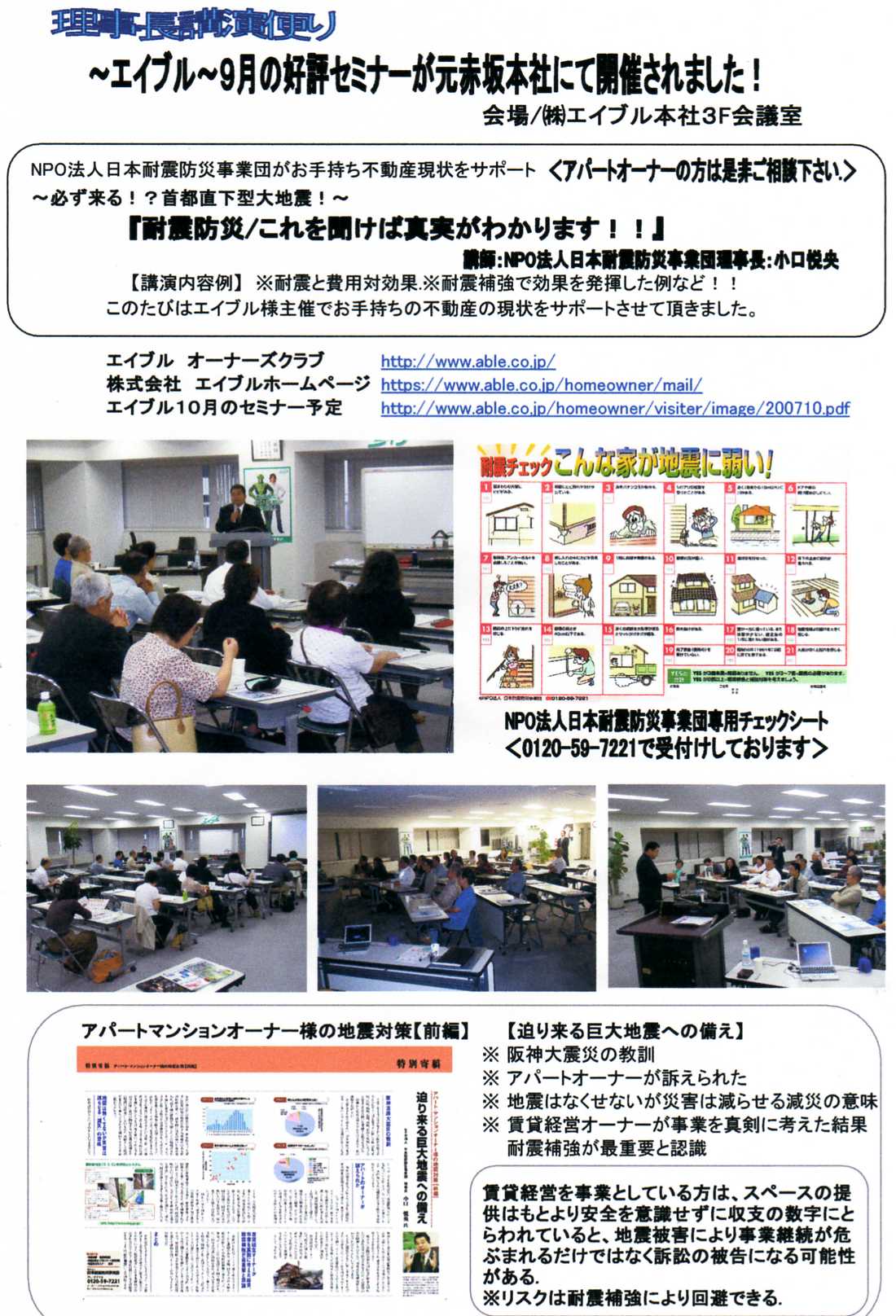 2007年9月29日土曜セミナー開催 場所:株式会社エイブル本社3F会議室 【講演内容例】※耐震と費用対効果.※耐震補強で効果を発揮した例など!! このたびはエイブル様主催でお手持ちの不動産の現状をサポートさせて頂きました。