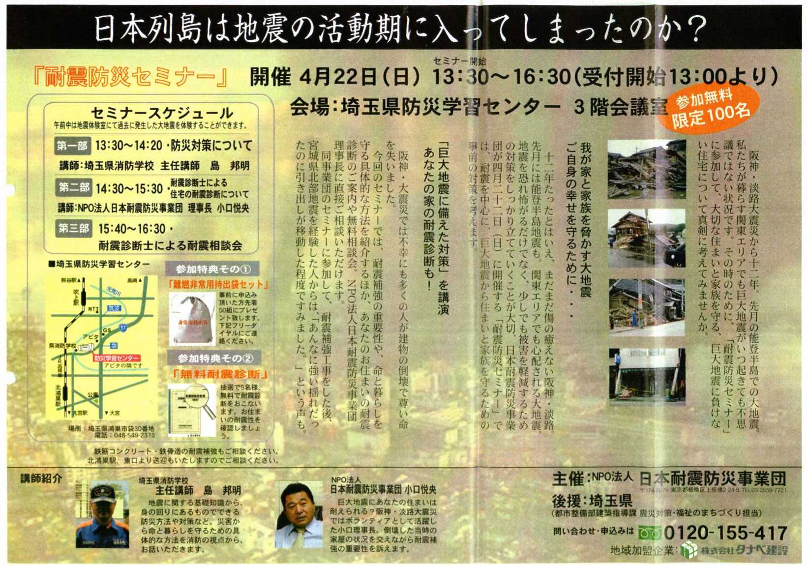 テーマ 『日本列島は地震の活動期に入ってしまったのか。』 埼玉県の後援にてNPO法人日本耐震防災事業団の主催により埼玉県の防災学習センター3階会議室にて開催致します。当日は耐震診断士による耐震相談会がございます。 <参加無料:限定100名> 申込みは 株式会社タナベ建設 【0120−155−417まで】
